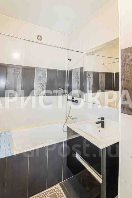 Ванная полностью оборудована: навесной шкаф,зеркало с полочками,навесная тумба под раковиной,ванна установлена на подиуме из керамогранита с ревизионным люком).