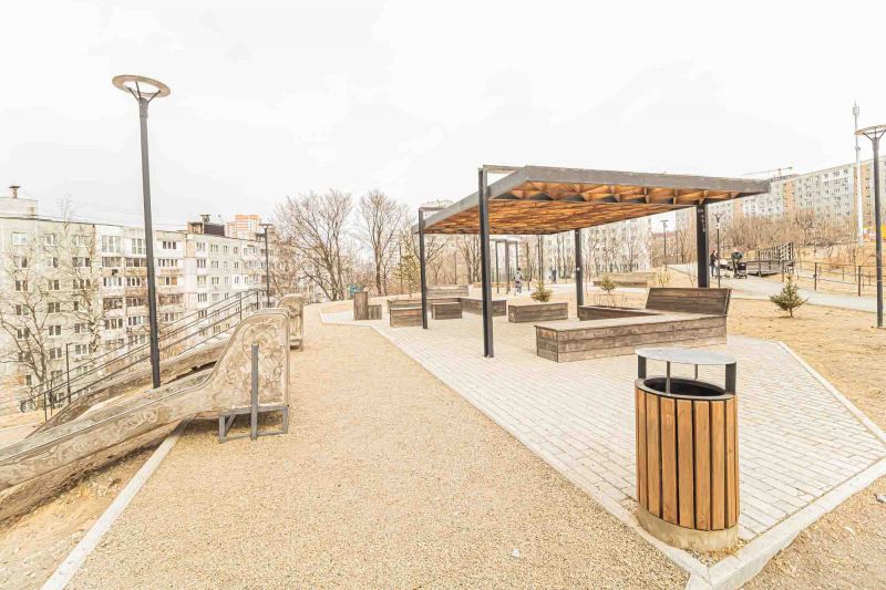* детская зона для подвижных игр и зона с навесами от солнца для отдыха родителей;