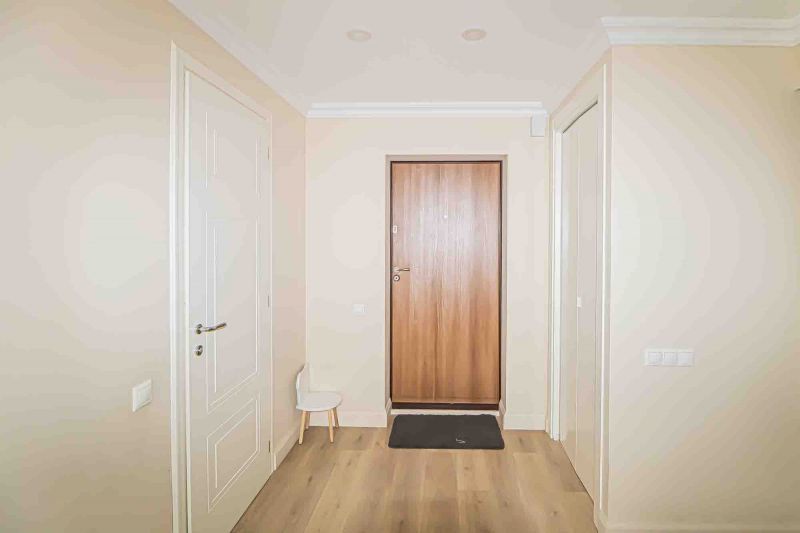 Гардеробные, Железная дверь, Ламинат, Межкомнатные двери, Натяжной потолок, Пластиковые окна, Софиты, Стены выровнены, Керамическая плитка.