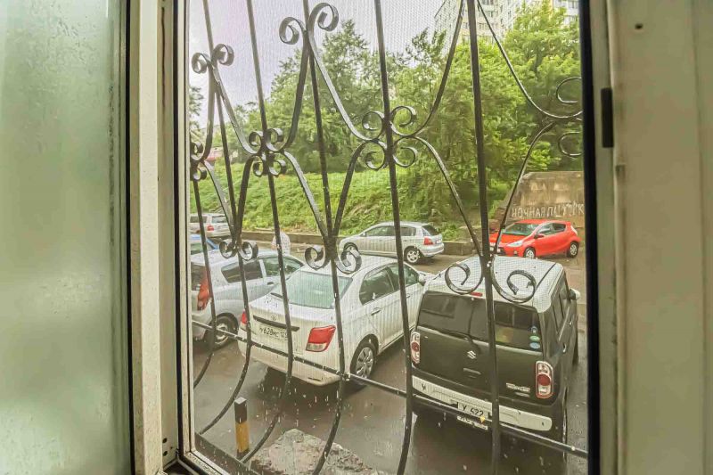 Ламинат, натяжной потолок, пластиковое окно, решетка на окне.